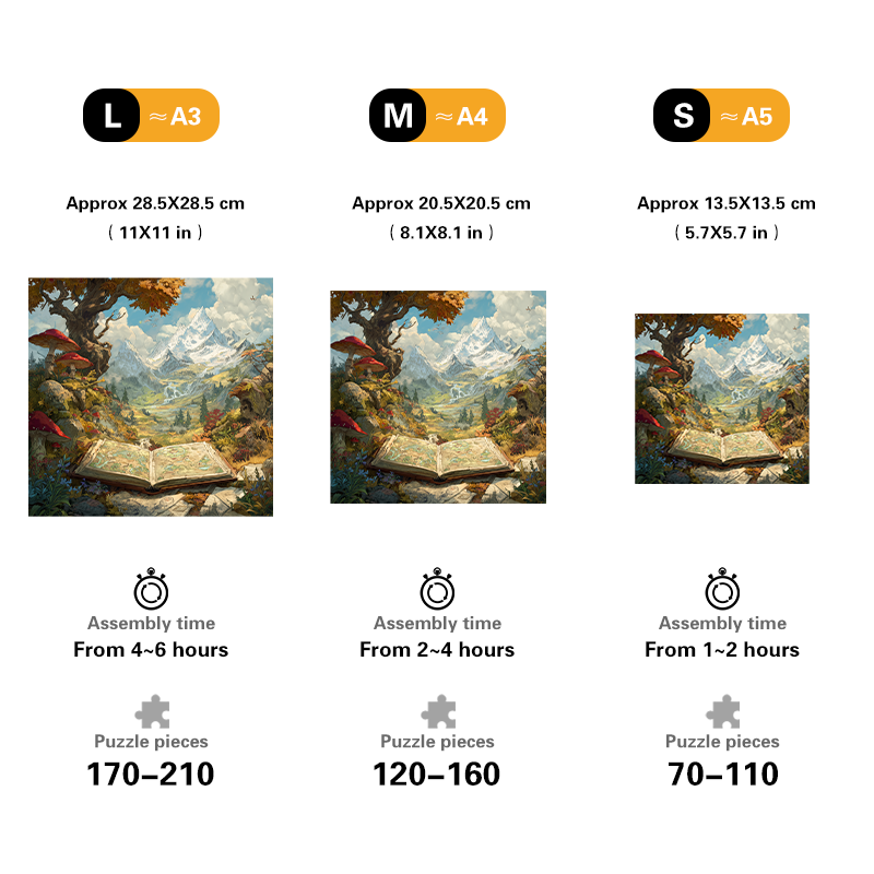 size:M(A4) Approx 35x35 cm (14x14 inches) - 120~160 pcs , assembly time 2-4 hours.