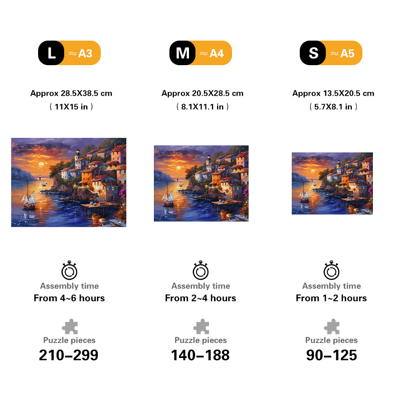 size:L(A3) Approx 45x45 cm (18x18 inches) - 170~210 pcs , assembly time 4-6 hours.